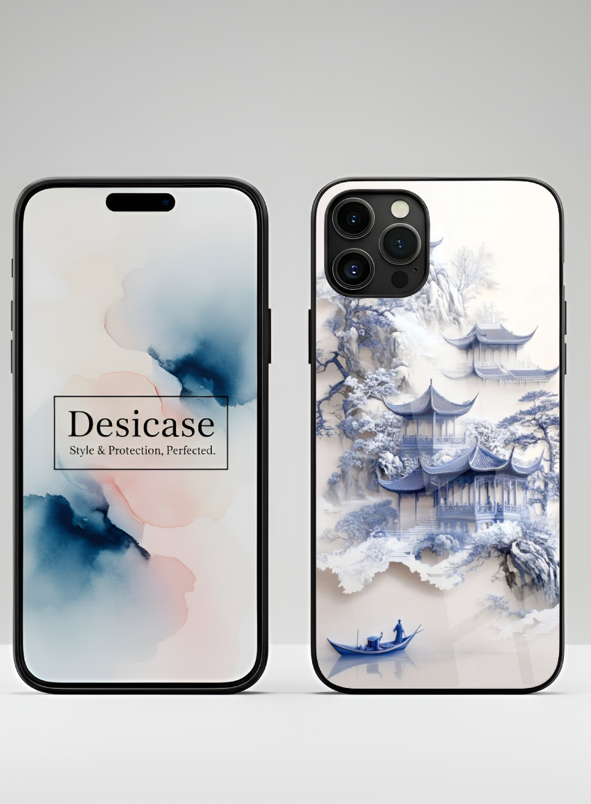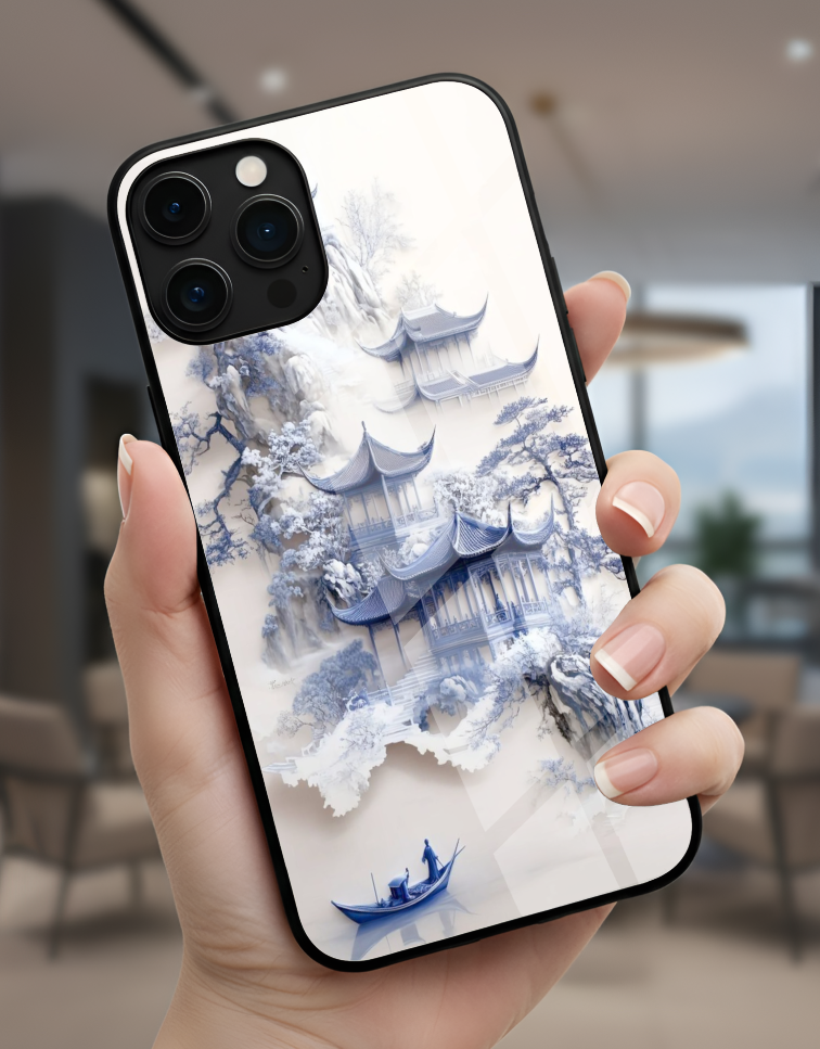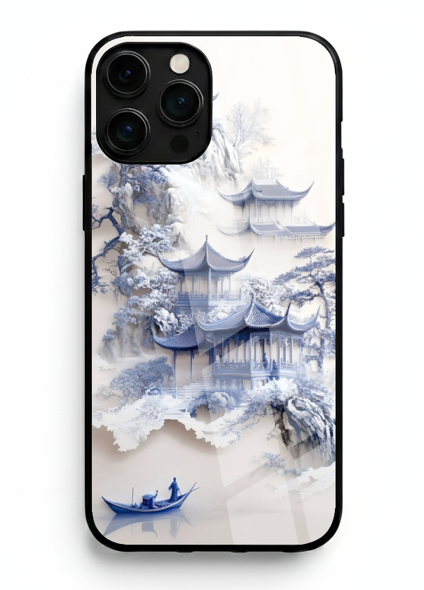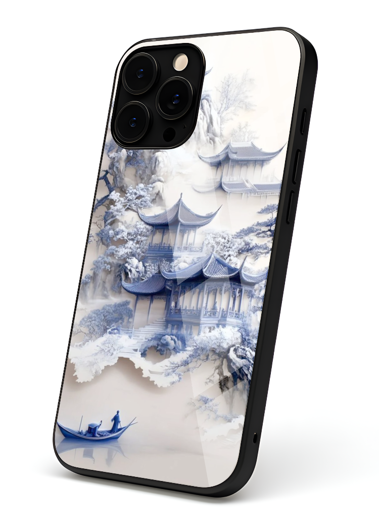 Blue Temple & Boat Glass Case – Oriental Calm Edition