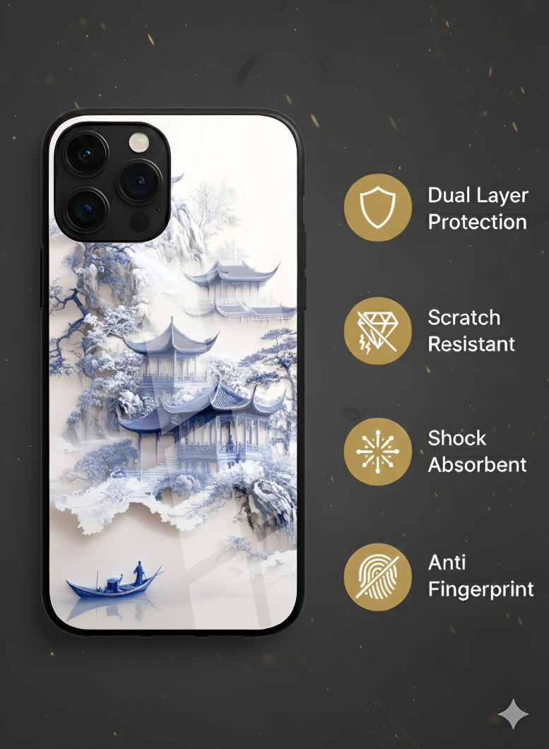 Celebrate tranquil beauty with a serene blue temple landscape and misty waters, printed in high definition beneath a crystal-clear glass back. This elegant case pairs museum-style visuals with everyday durability: a tempered glass surface resists scratches, and flexible TPU edges cushion impacts. The slim profile keeps your device sleek, while accurate cutouts and tactile buttons preserve perfect usability. Sophisticated, calming, and crafted for long-lasting clarity & protection.